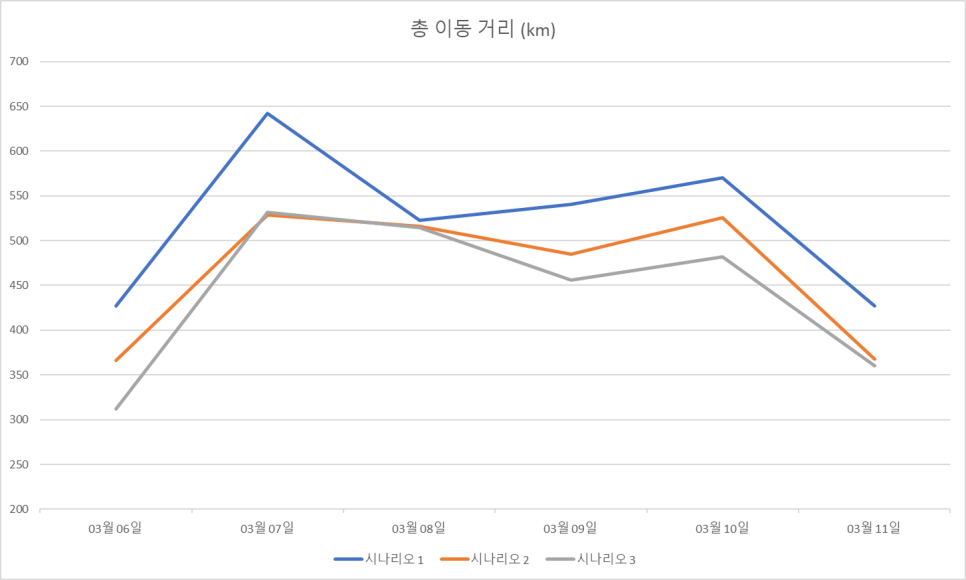 시뮬레이션은 시 시나리오는 크게 기존 방식(수기) 배차와 경로 최적화, 거기에 이동 거리와 업무량을 균등화 총 3가지의 시나리오를 가지고 테스트를 진행했어요. 기존의 배차 방식과 루티의 경로 최적화 및 자동 배차 시 이동거리와 이동시간에 있어 얼마나 개선이 되는지를 중점으로 보았어요.