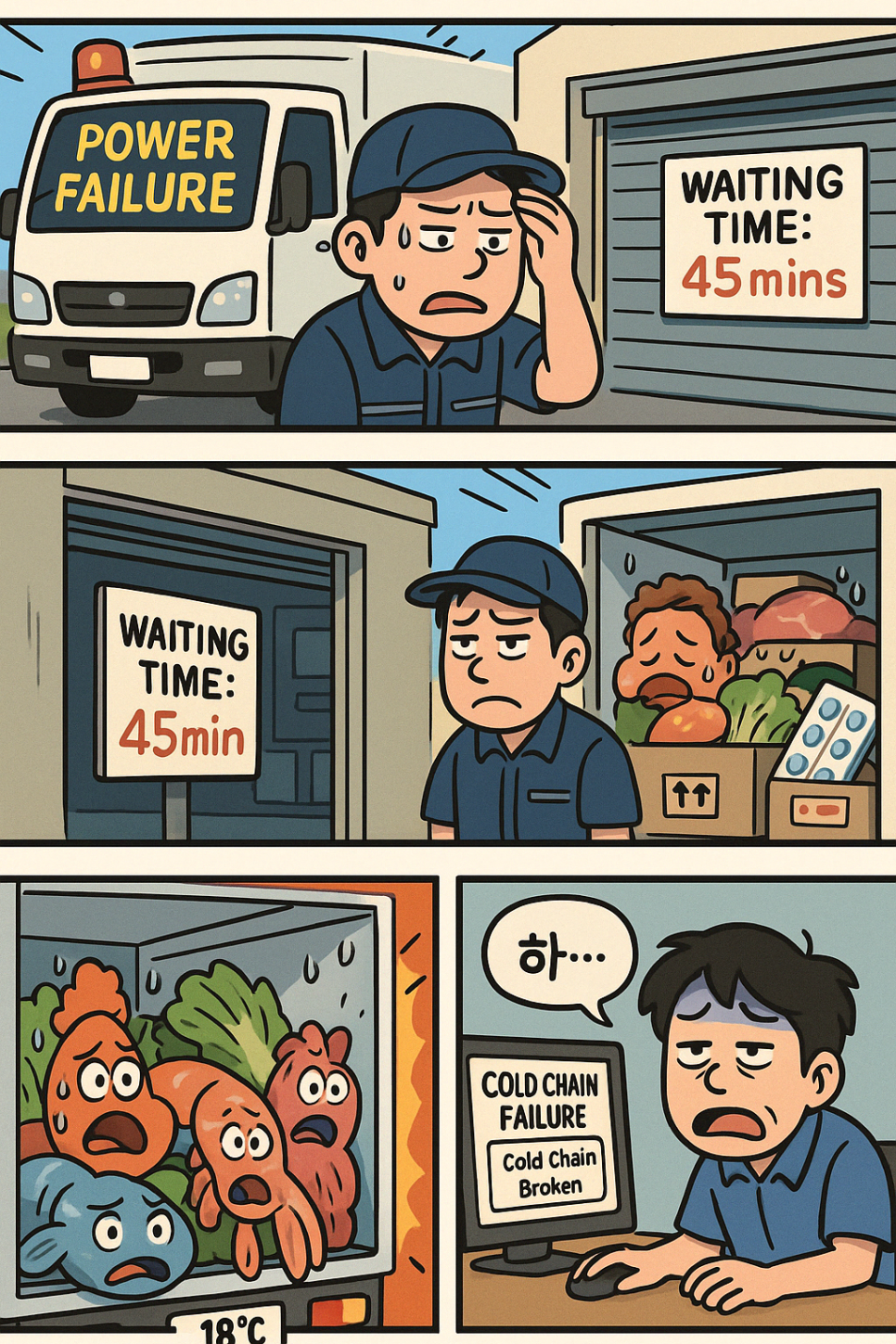 ✅도착 후 창고 반입까지 장시간 대기: 제품은 목적지에 도착했지만 창고가 혼잡하거나 하역 지연으로 인해 냉동·냉장 상태가 유지되지 못하는 경우가 많습니다.