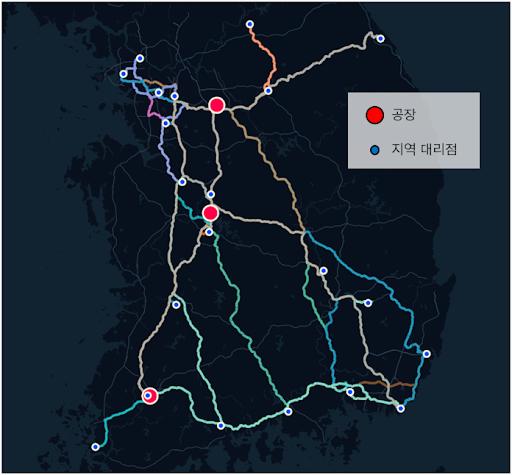 고객사 공장-직매장 배차 경로 최적화 예시 출처: (주)위밋모빌리티