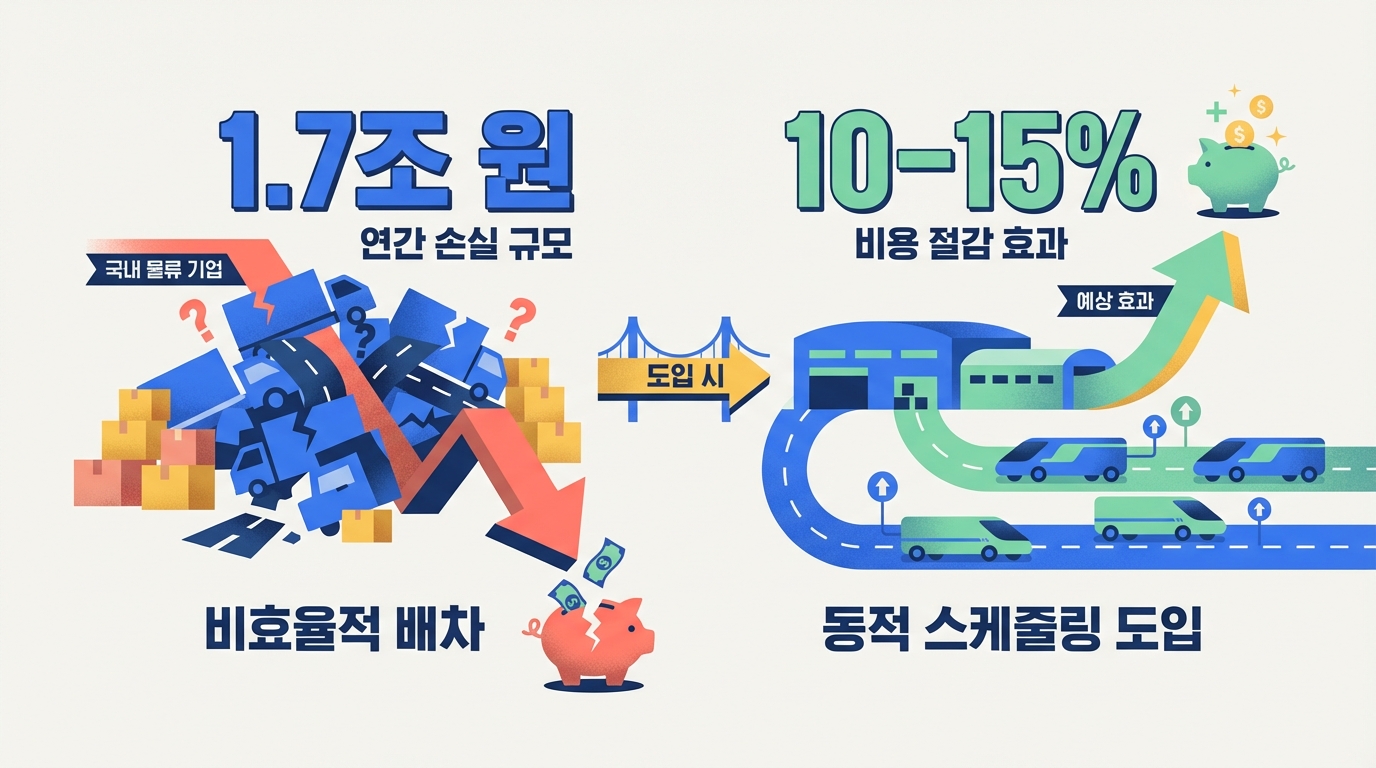 최신 물류 시장 보고서에 따르면, 미들마일 및 라스트마일 구간의 비효율적 배차 운영으로 인한 국내 기업의 연간 손실은 약 1.7조 원에 달하는 것으로 추정됩니다. 이는 단순한 비용 누수를 넘어 기업의 경쟁력을 심각하게 저해하는 문제입니다.
