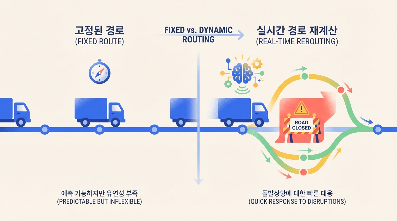 모든 변수를 ‘비용’으로 환산하여 의사결정을 내리는 시스템을 구축해야 합니다. 단순히 거리가 아닌, 70여 가지 제약 조건을 통합 비용 함수로 계산하여 전체 운영 효율을 극대화하는 방식은 평균 운송 비용을 10~15% 절감하는 효과를 가져올 수 있습니다.실시간 ‘오케스트레이션’ 역량 확보