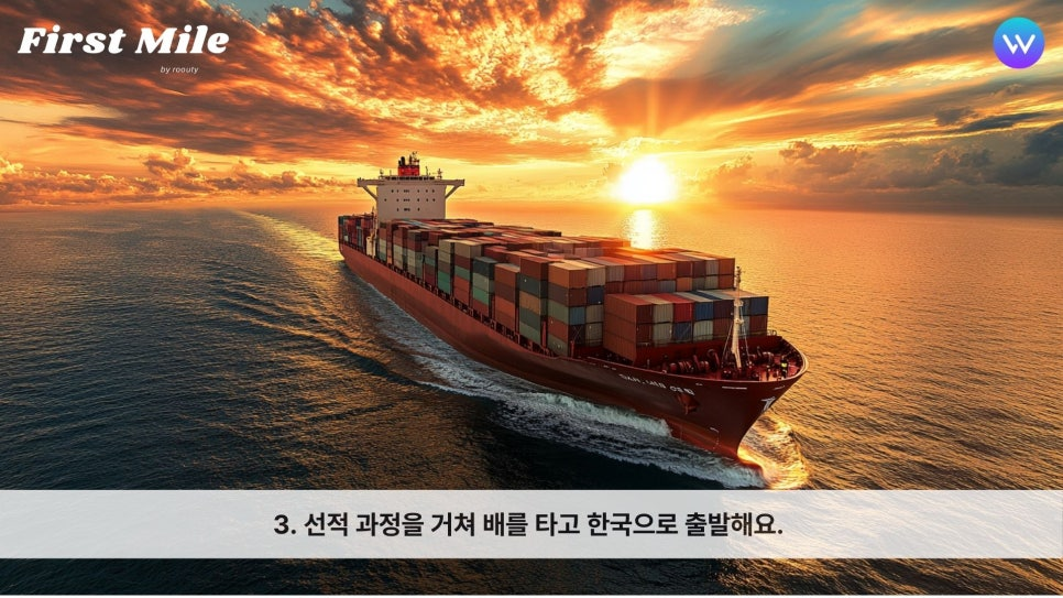 선적 과정을 거쳐 배를 타고 한국으로 출발해요.