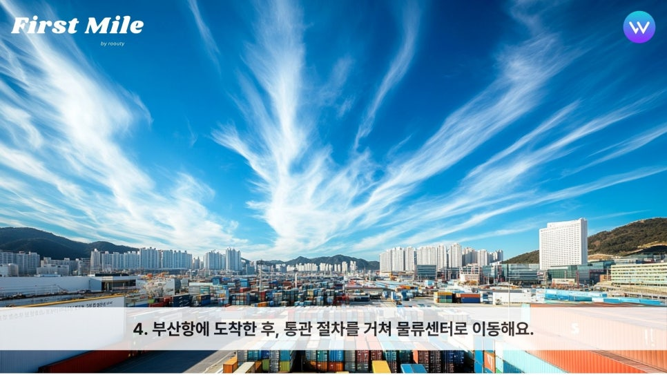 부산항에 도착한 후, 통관 절차를 거쳐 물류센터로 이동해요.